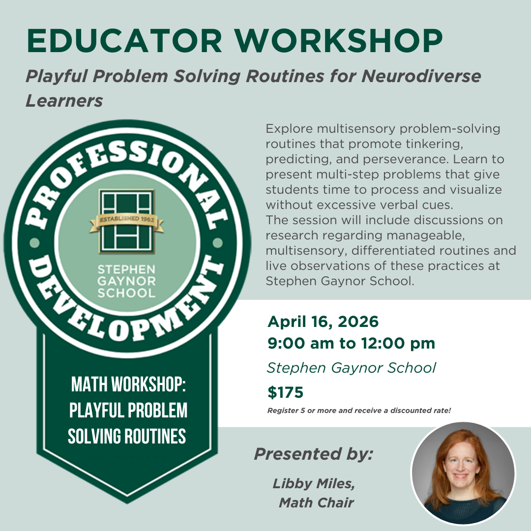 In this session, we will explore multisensory problem solving routines that promote tinkering, predicting, and persevering while also supporting students who just want to know how to get to the answer. We will practice introducing multi-step problems in a way that allows students time to process and visualize without any additional verbal cueing. Then we will discuss the research behind manageable, multisensory, differentiated routines and visit Stephen Gaynor School classrooms to see some of these routines in action.